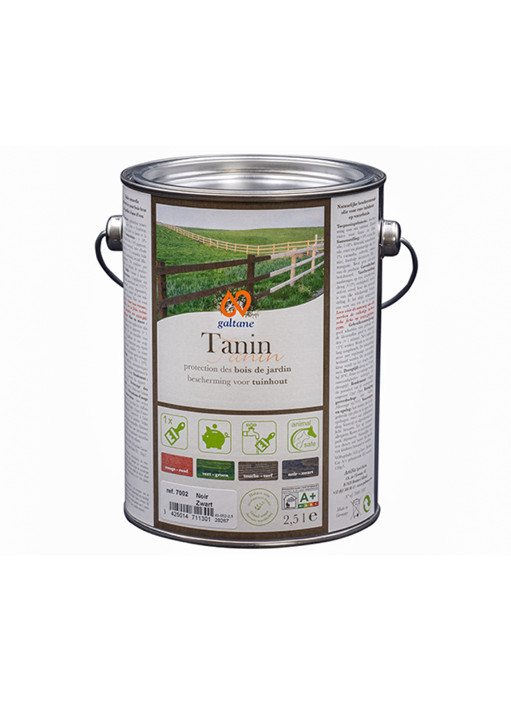Tanin - Eenlagige oplossing voor ruw tuinhoutNatuurlijke beschermende olie op waterbasis voor al uw tuihout: moestuinhout, piketten, paalwerk, speeltuigen, kippenhokken, paardenboxen, hondenhokken, afdaken... Zonder oplosmiddel. Ongevaarlijk voor planten en dieren. Eigenschappen: beschermt tegen veroudering van hout buitenshuis door weersomstandigheden. Voorkomt aantasting van de lignine aan de oppervlakte van het hout en verhindert daardoor vergrauwing en barsten in het hout.