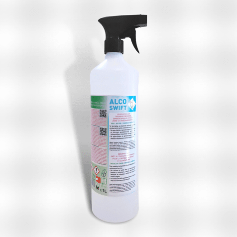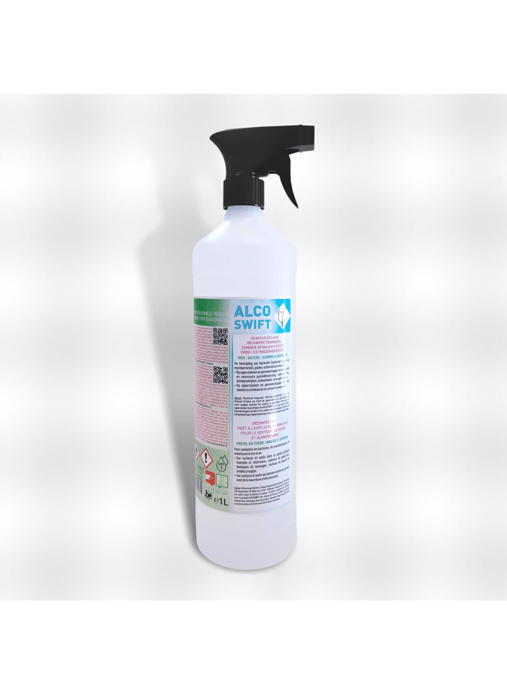 Gebruiksklaar desinfectiemiddel zonder spoelen voor de zorg- en voedingssector. Ter bestrijding van bacteriën (exclusief sporen en microbacteriën), gisten, schimmels en virussen. Op oppervlakken en gereedschappen in de humane en veterinaire gezondheidszorg, pedicure- en taboepraktijken, schoonheids- en nagelstudio's. Op oppervlakken en gereedschappen die met voedsel en drinkwaren in contact kunnen komen. Gebruik : Onverdund toepassen. Minimale contacttijd 5 minuten. Verbruik : 20 - 50 ml per 0,5 m² Oppervlakken en gereedschappen eerst reinigen alvorens het product te gebruiken. Vervolgens de oppervlakken bevochtigen met Alcoswift d.m.v. een tissue of doek. Wachten tot het gereedschap of oppervlak droog is alvorens het te gebruiken.