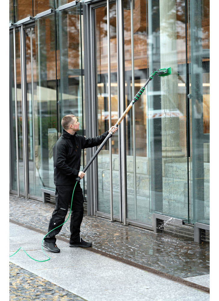 - Geleiding van de nieuwe, zeer flexibele DuroFlex slang door de telescoopsteel voor het probleemloos reinigen van ruiten en gevels