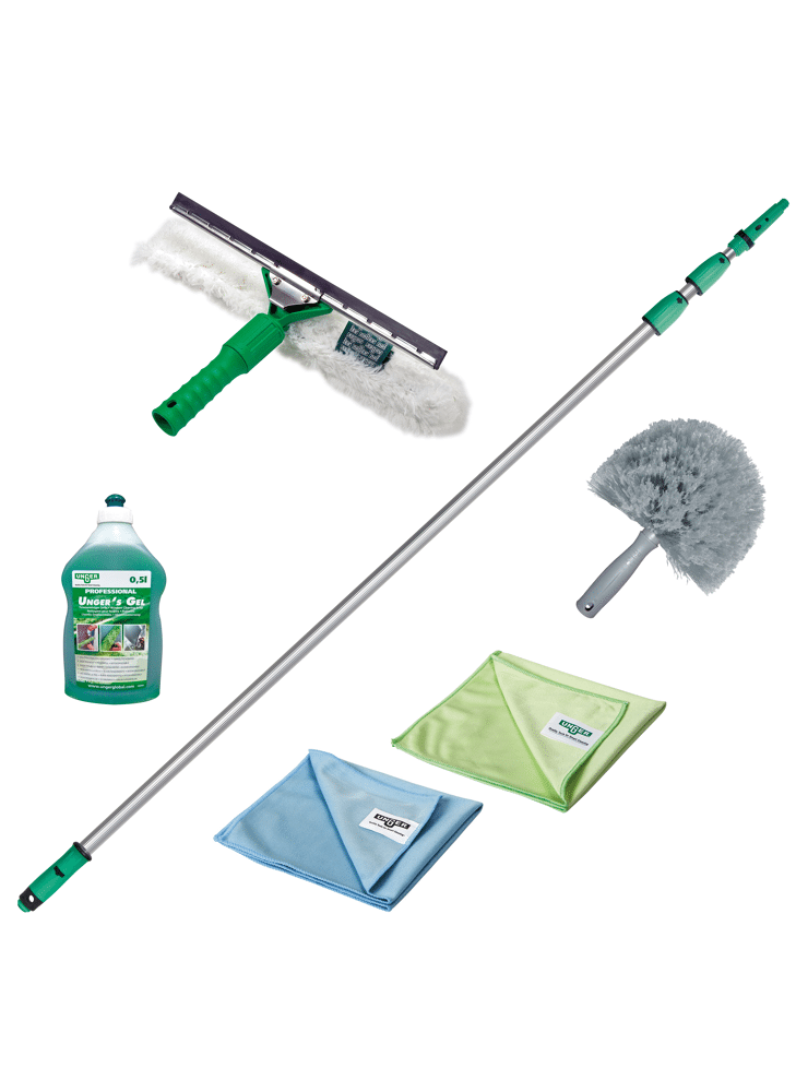 Inhoud: ED450 OptiLoc Telescoopsteel, 3-delig, 4,50 m VP350 VisaVersa® 35 cm FG050 UNGER's Gel Glazenwasserszeep 0,5 ltr MF40L MicroWipe Microvezeldoek 40 x 40 cm MF40E MicroWipe Microvezeldoek Lite 40 x 40 cm COBW0 StarDuster® Stofborstel 20 cm