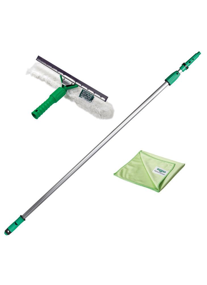 Starterset voor het reinigen met een telescoopsteel. Bevat een ideale basisuitrusting voor het reinigen van glas, serres en veranda's met een telescoopsteel.